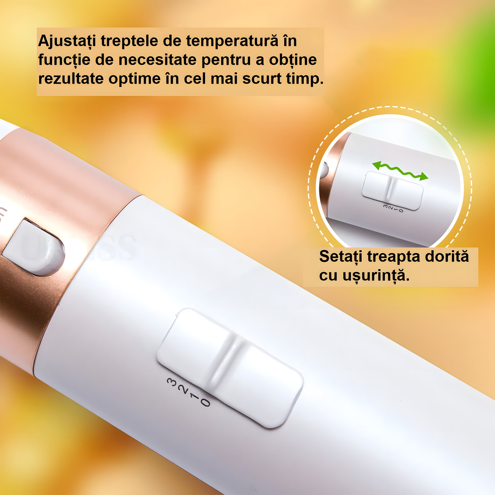 In concluzie, peria electrica de par cu 7 capete interschimbabile reprezinta o alegere ideala pentru cei care cauta un dispozitiv eficient si versatil pentru coafarea parului acasa sau in calatorii. Cu capacitati multiple si caracteristici inovatoare, acest instrument simplifica procesul de coafare si permite utilizatorilor sa obtina rezultate profesionale in confortul propriului mediu. Fiind portabila si usor de utilizat, peria electrica este un partener de incredere pentru oricine isi doreste sa-si exprime creativitatea si sa-si imbunatateasca stilul personal. Cu un design modern si elegant, acest produs nu doar indeplineste functia sa principala, ci si completeaza estetica spatiului de coafura.