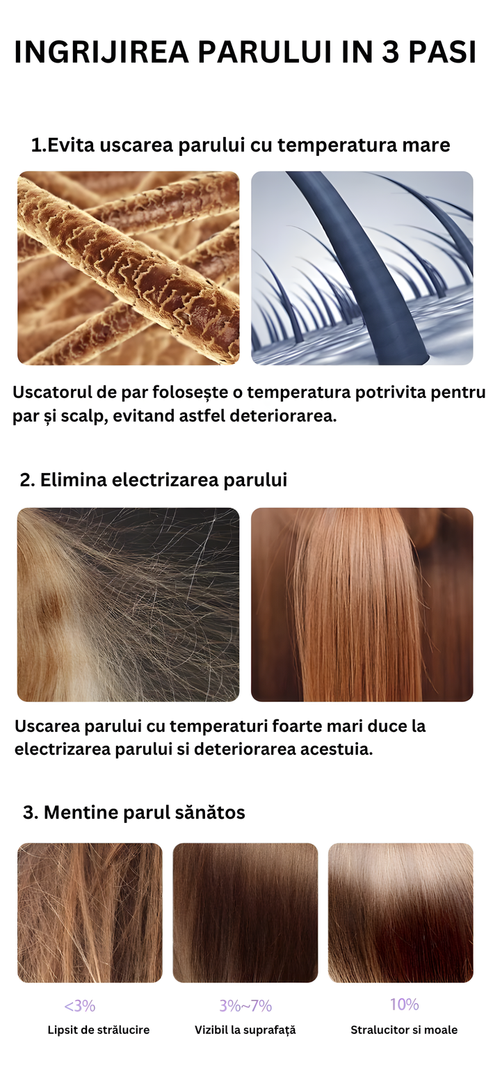 Uscarea parului cu temperaturi foarte mari duce la electrictrizarea firelor de par, lasand un aspect neplacut si la deteriorarea acestora in timp. Uscatorul foloseste temperatura optima fara a deteriora parul, reducand caderea parului si lasandu-l stralucitor si moale.