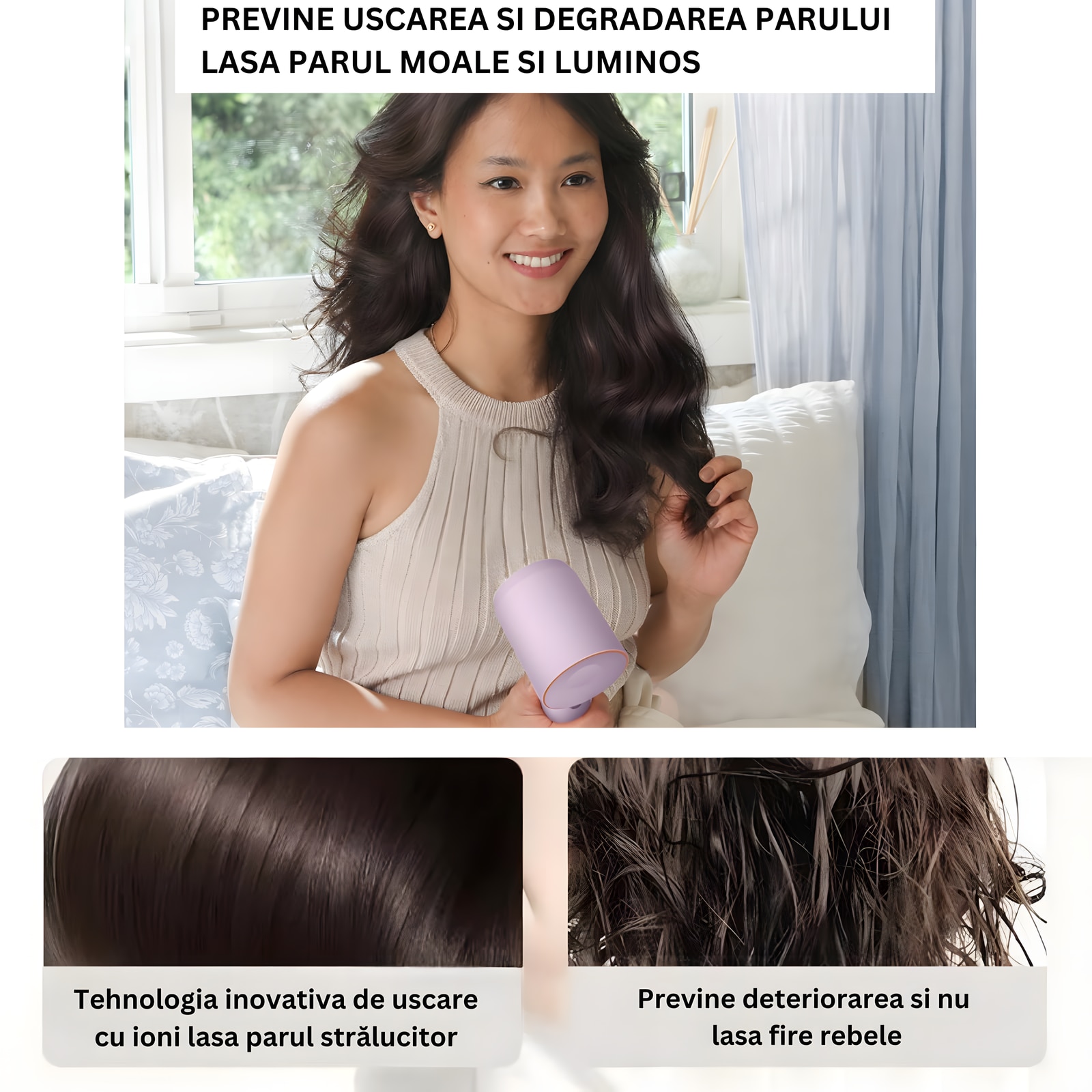 Uscatorul este echipat cu o tehnologie avansata de ionizare care protejeaza firul de par impotriva deteriorarii cauzate de caldura excesiva. Astfel, iti poti mentine parul sanatos si stralucitor in fiecare zi, fara electrizare.
